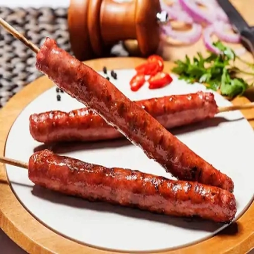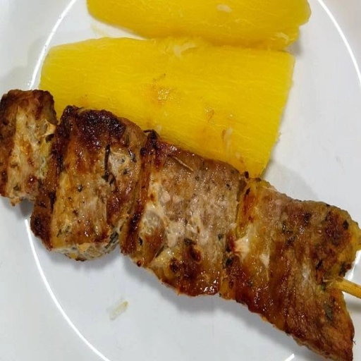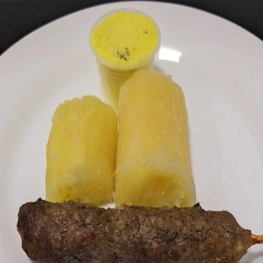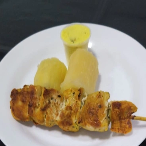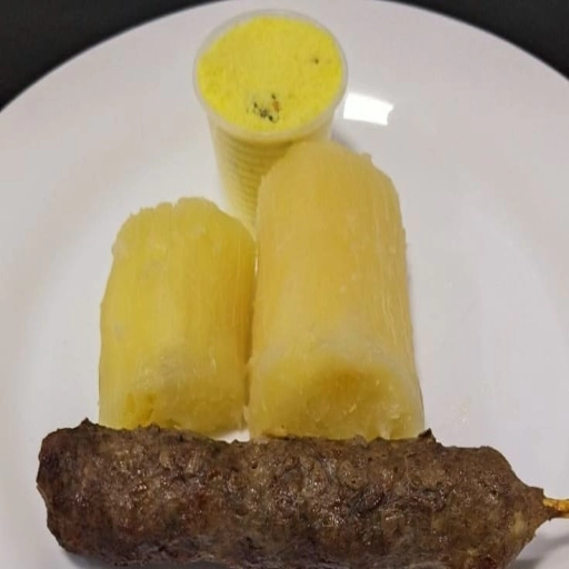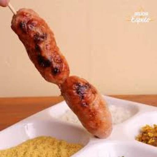 espeto de kafta de de frango com queijo acompanahmento farofa e macaxeira