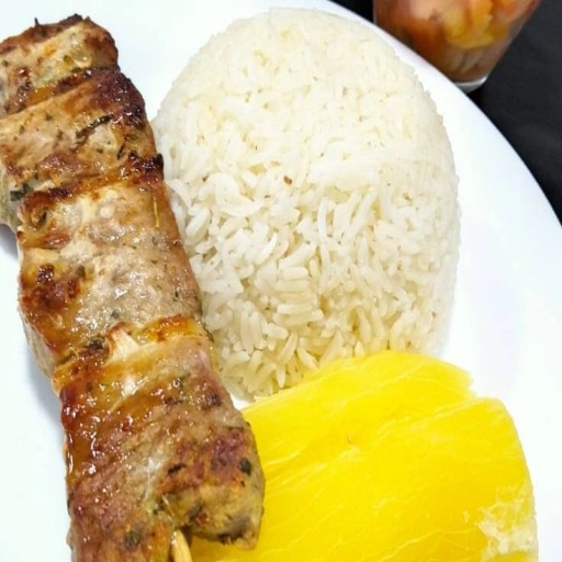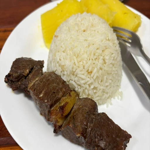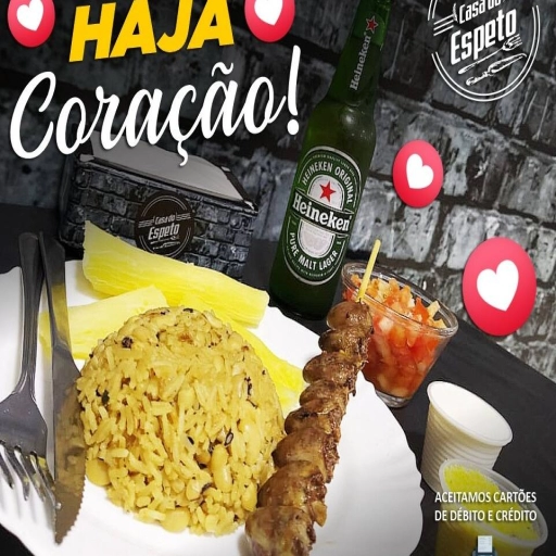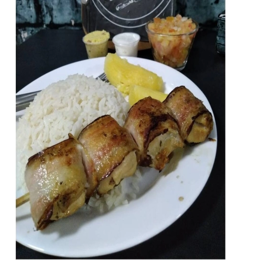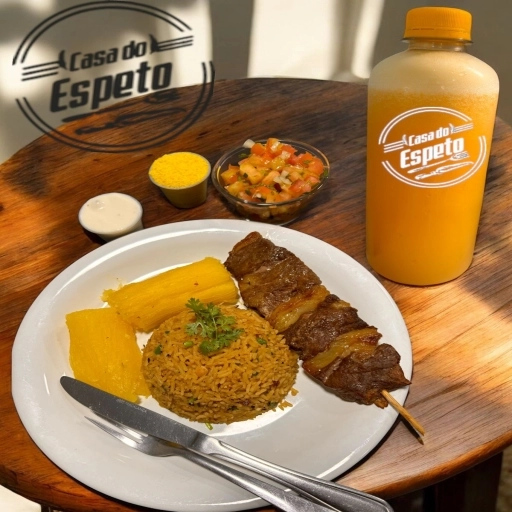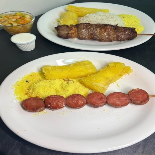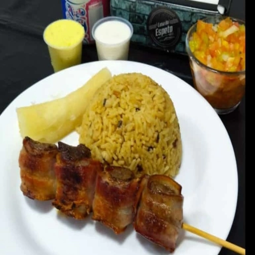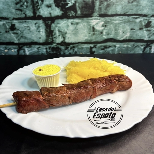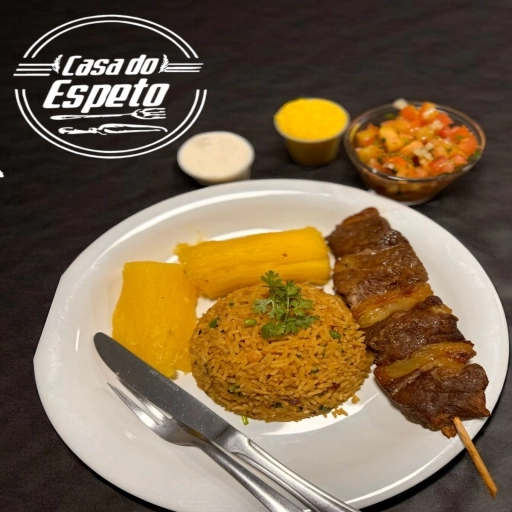 Espeto completo, acompanha arroz branco ou baião de dois, farofa, macaxeira cozida, creme de alho e vinagrete.