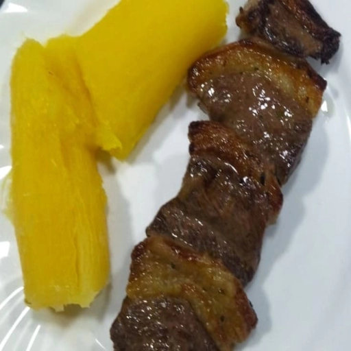 Espeto Simples, Acompanhado de farofa e macaxeira cozida.